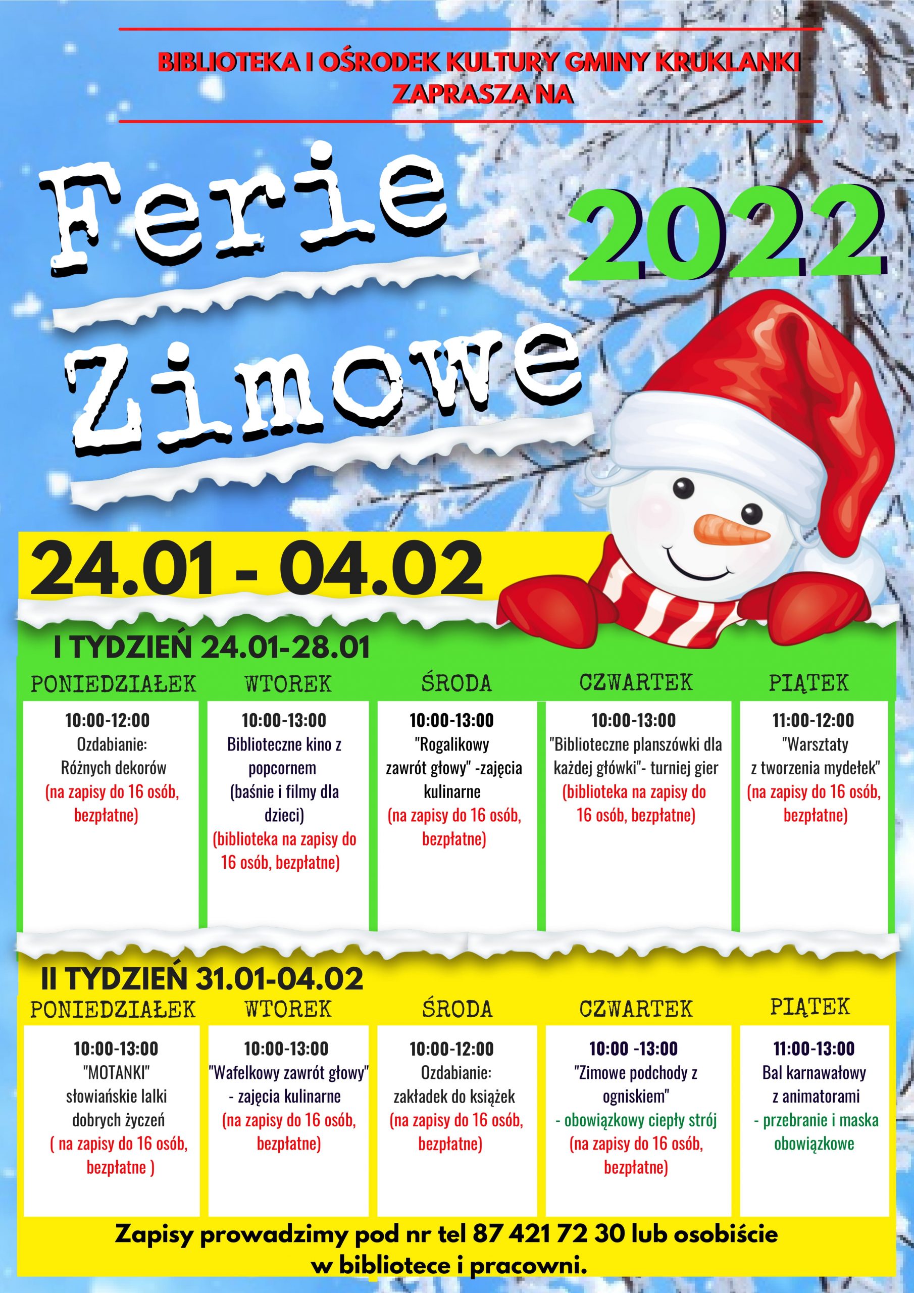 14 stycznia 2022AKTUALNOŚCIgok Zapraszamy na wspólne spędzanie Ferii Zimowych w Bibliotece i Ośrodku Kultury Gminy Kruklanki. Szczegółowy plan zajęć na plakacie. Wszystkie zajęcia są na zapisy pod nr tel. 87 421 72 30 lub osobiście w naszej placówce.