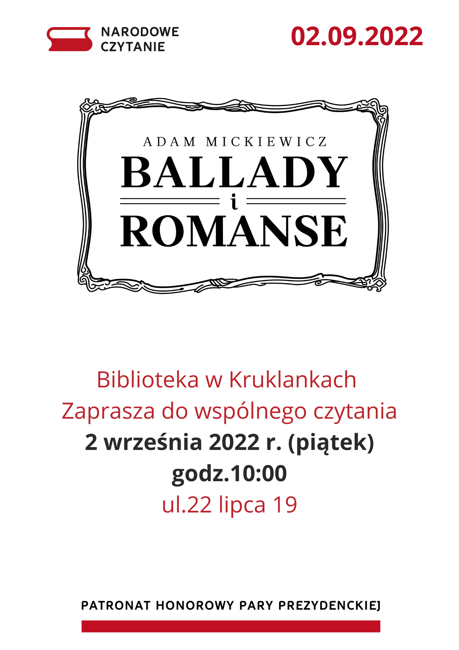 Biblioteka w Kruklankach zaprasza do wspólnego czytania 2 września 2021 r. (piątek) godz.10:00. Tym razem będziemy czytać "Ballady i romanse" A.Mickiewicza.