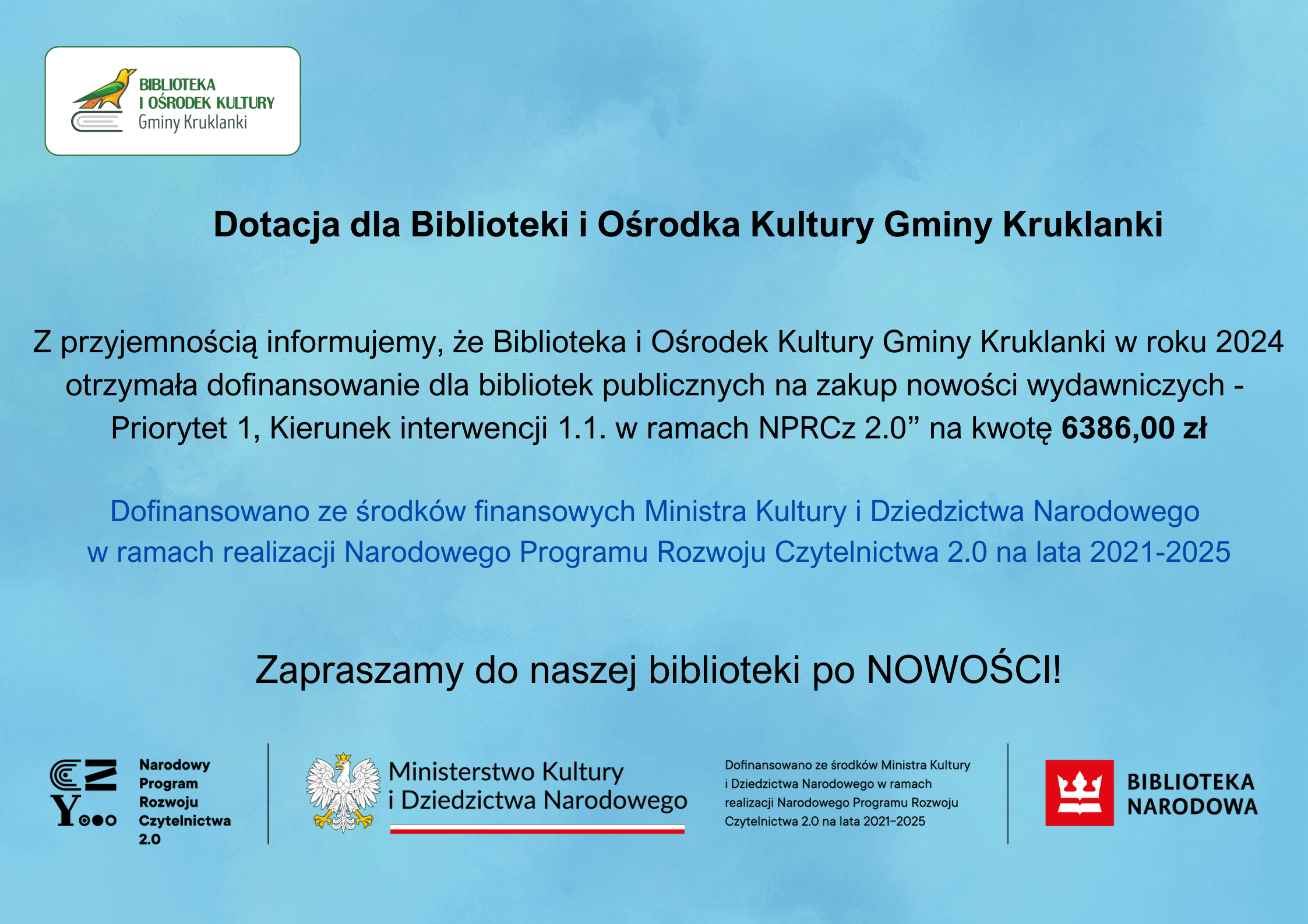 2 września 2024AKTUALNOŚCIgok Informujemy, że nasza biblioteka otrzymała dotację na zakup i zdalny dostęp do nowości wydawniczych w kwocie 6386,00 zł.