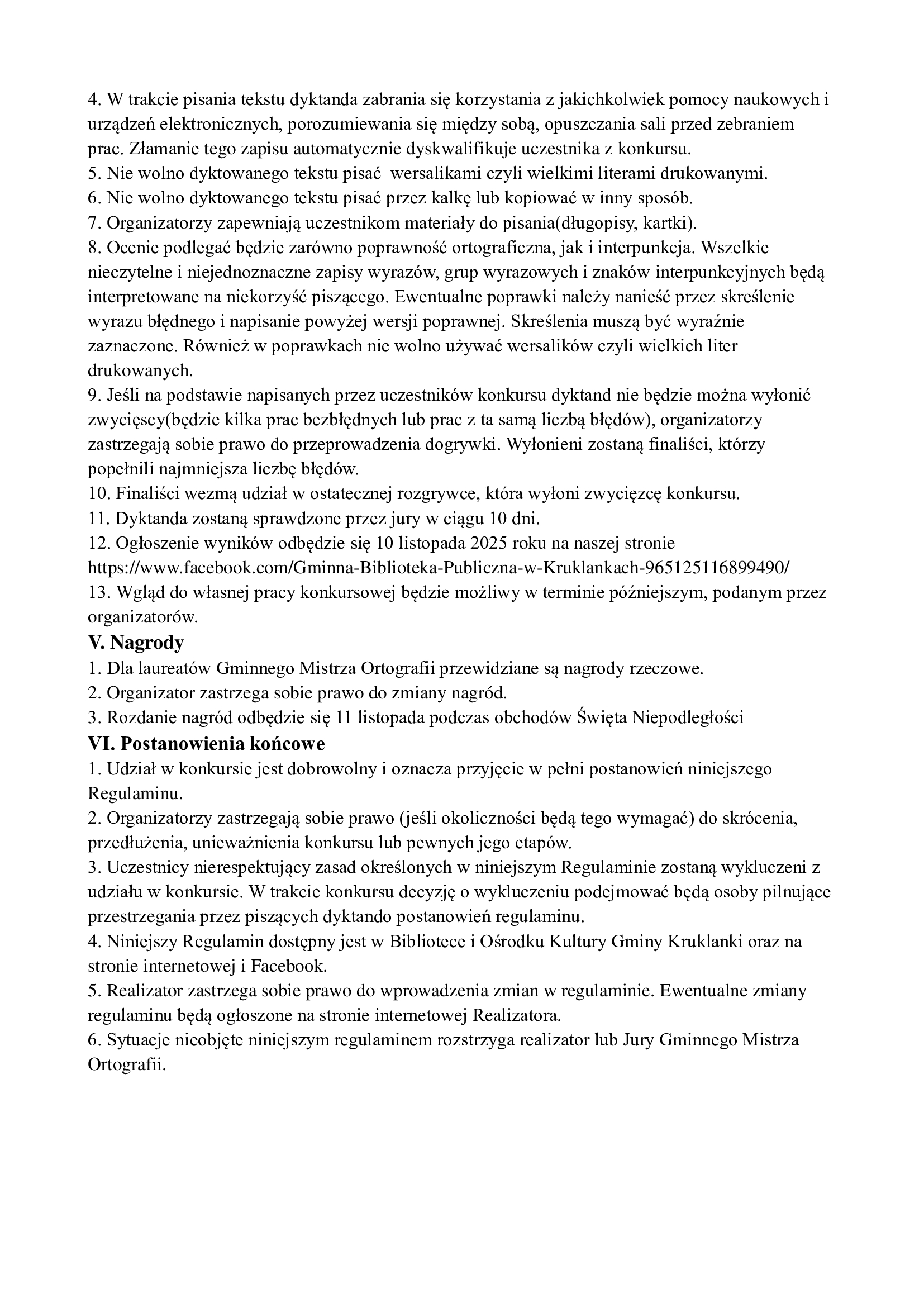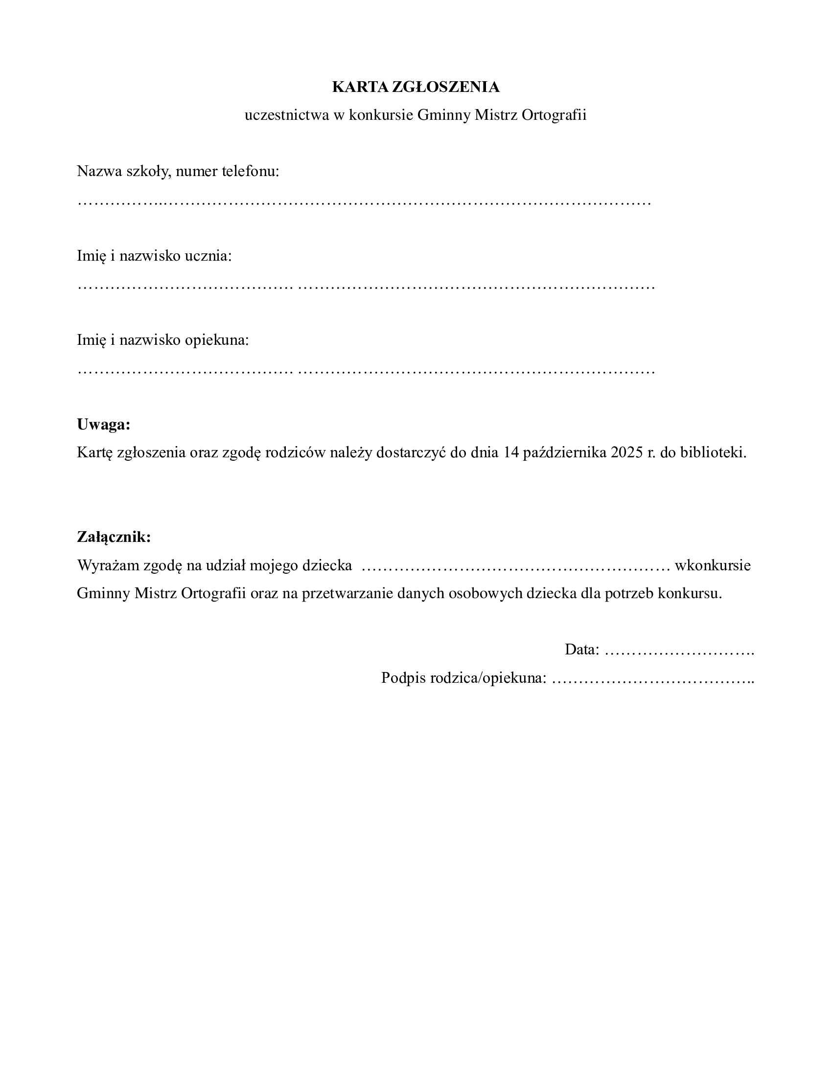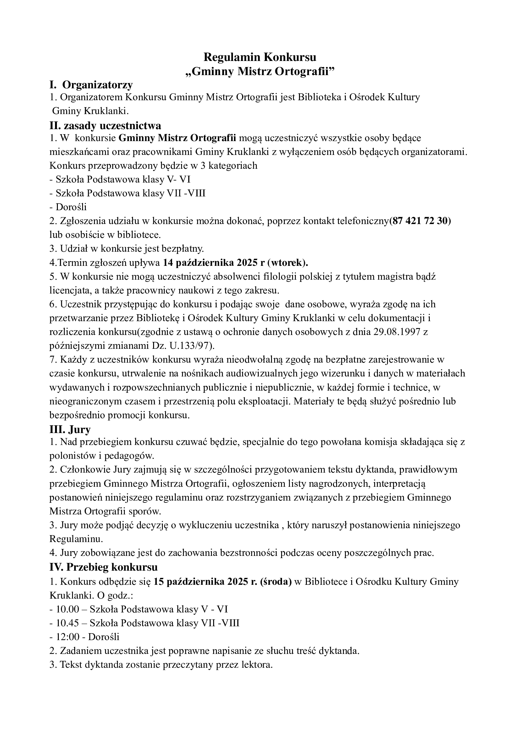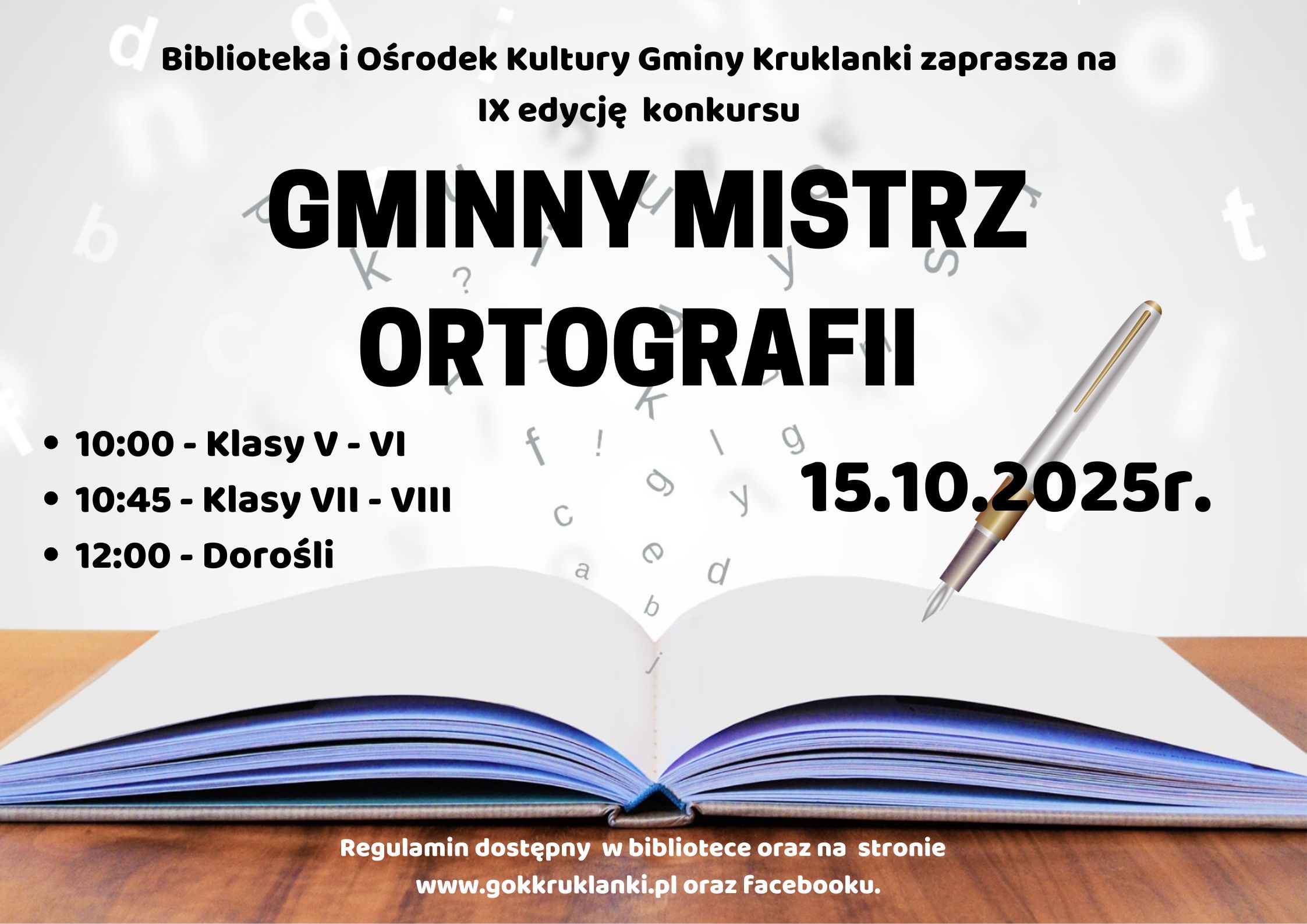 Zapraszamy na dziewiątą edycję konkursu ortograficznego, pod nazwą „Gminny Mistrz Ortografii”. Konkurs skierowany jest do osób, którym rozwiązywanie dyktand sprawia przyjemność. Start konkursu już w środę 15 października, o godz. 10:00 - klasy V-VI, 10:45 - klasy VII-VIII oraz 12:00 - dorośli.