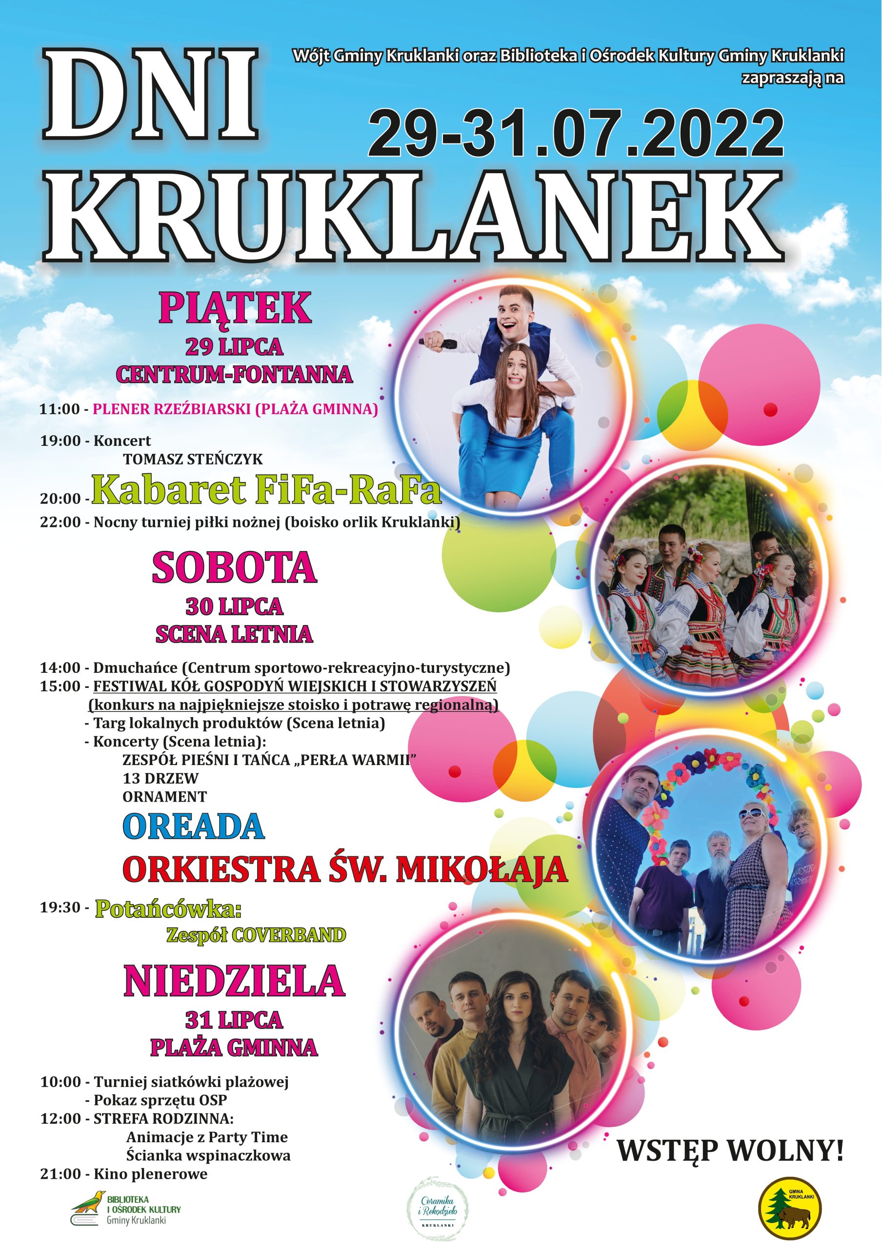 12 lipca 2022AKTUALNOŚCIgok Zapraszamy w dniach 29-31.07. 2022 r. do Kruklanek na kolejną edycję imprezy Dni Kruklanek 2022.