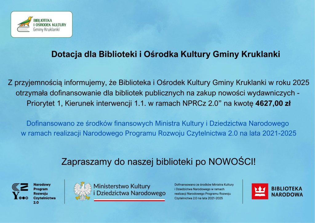 8 października 2025AKTUALNOŚCIgok Informujemy, że nasza biblioteka otrzymała dotację na zakup i zdalny dostęp do nowości wydawniczych w kwocie 4627,00 zł.