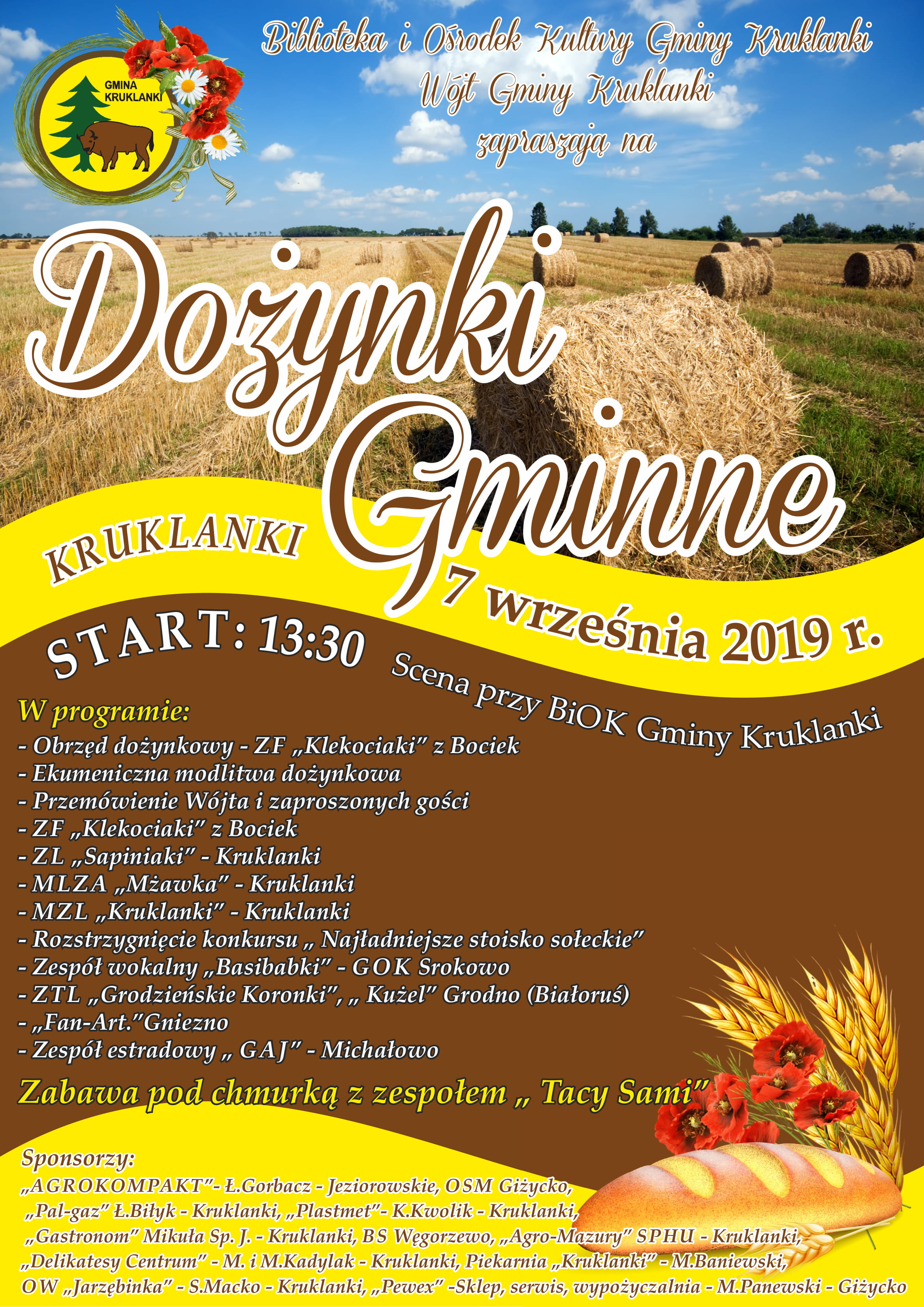 26 sierpnia 2019AKTUALNOŚCIgok W sobotę 7 września o godz. 13:30 przy BiOK Gminy Kruklanki odbędą się Dożynki Gminne. Serdecznie zapraszamy!