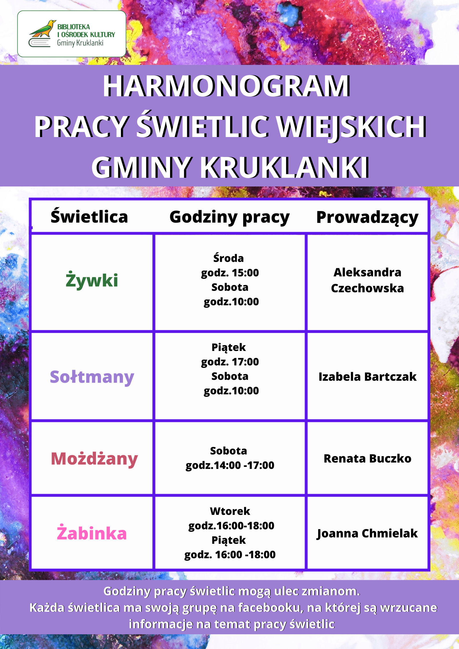 21 listopada 2022AKTUALNOŚCIgok Zapraszamy do zapoznania się z harmonogramem pracy świetlic wiejskich Gminy Kruklanki.