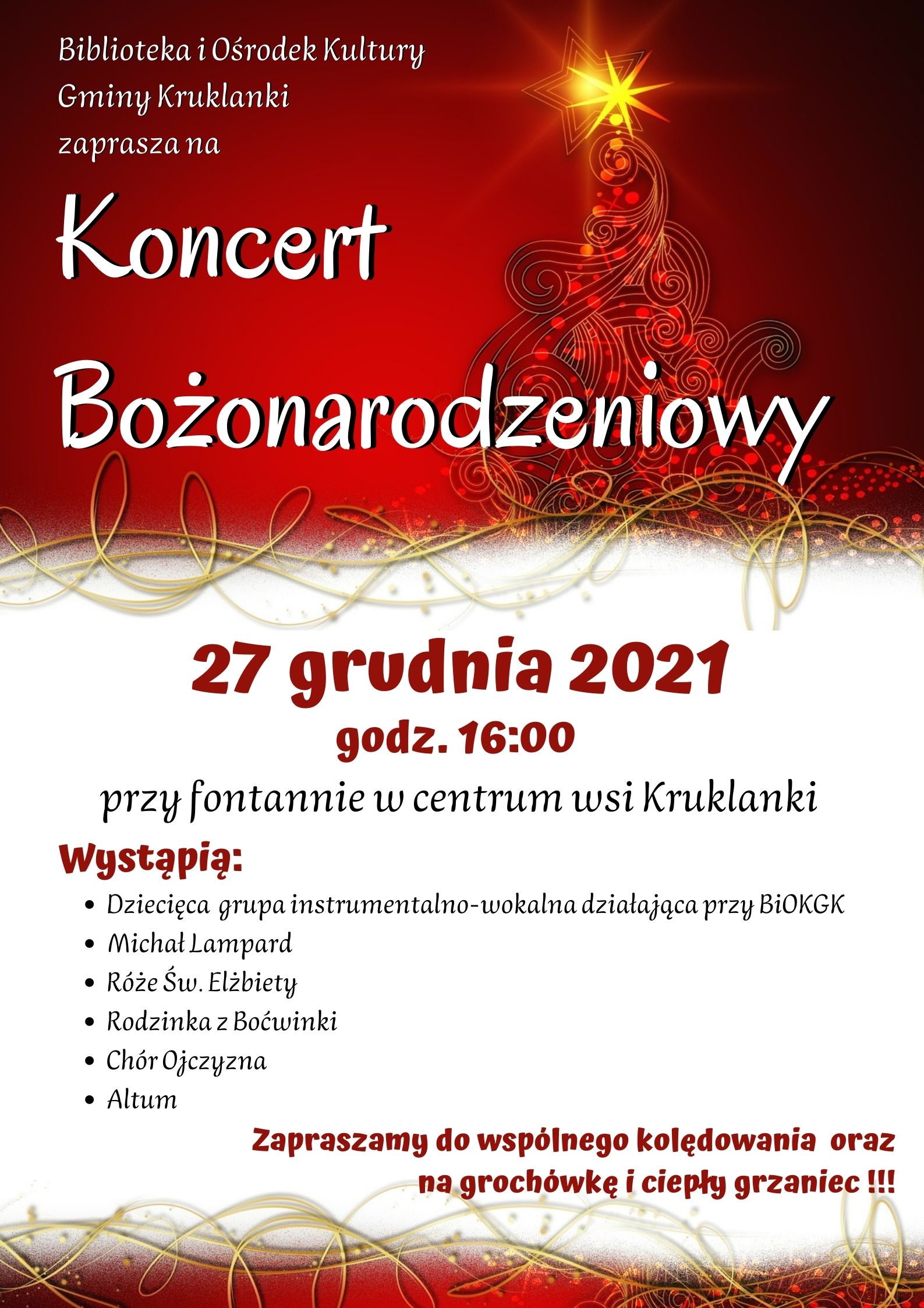 22 grudnia 2021AKTUALNOŚCIgok 27 grudnia 2021 roku o godz. 16:00 przy fontannie w centrum wsi Kruklanki odbędzie się Koncert Bożonarodzeniowy. Serdecznie zapraszamy do wspólnego kolędowania oraz na ciepłą grochówkę i grzańca. 🙂