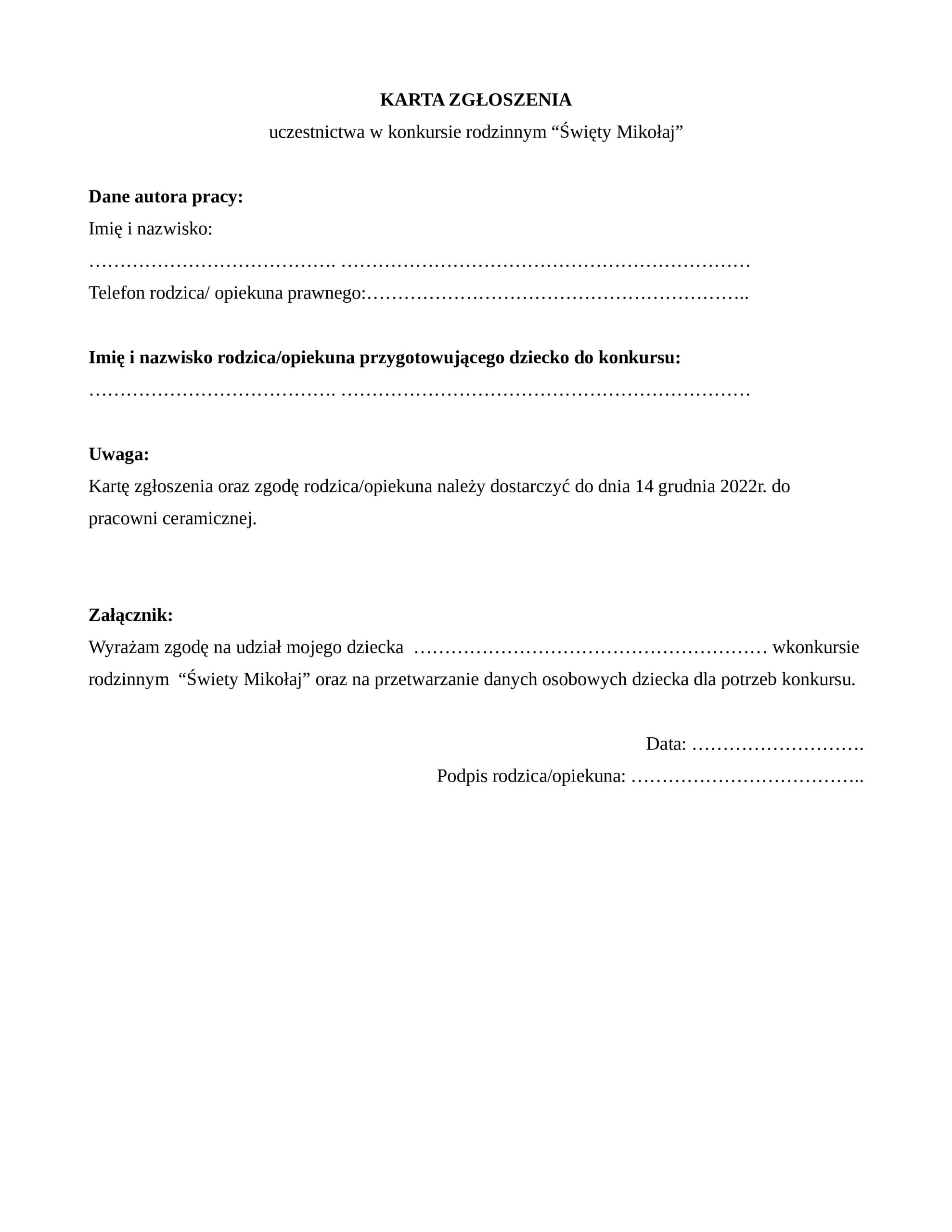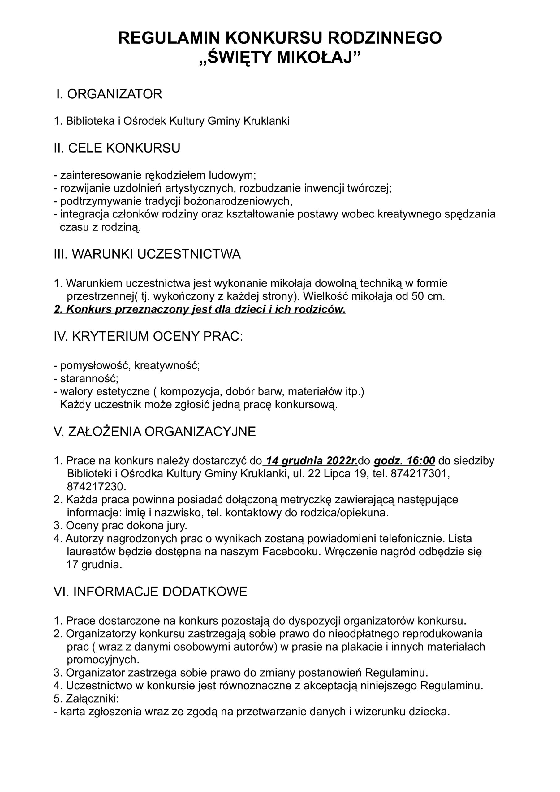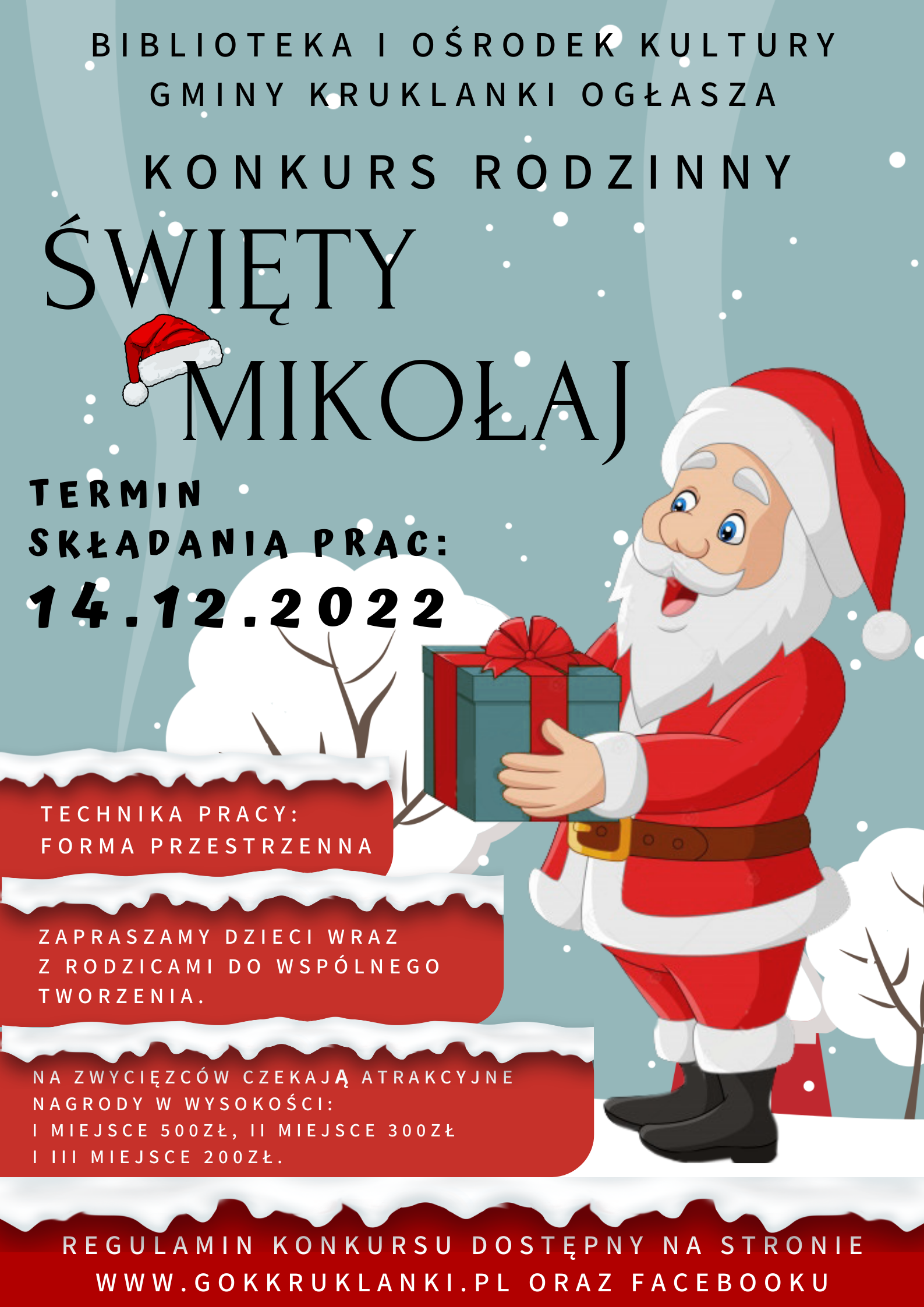23 listopada 2022AKTUALNOŚCIgok Serdecznie zapraszamy do wzięcia udziału w konkursie rodzinnym pt.: „Święty Mikołaj" Konkurs skierowany jest do dzieci wraz z rodzicami.