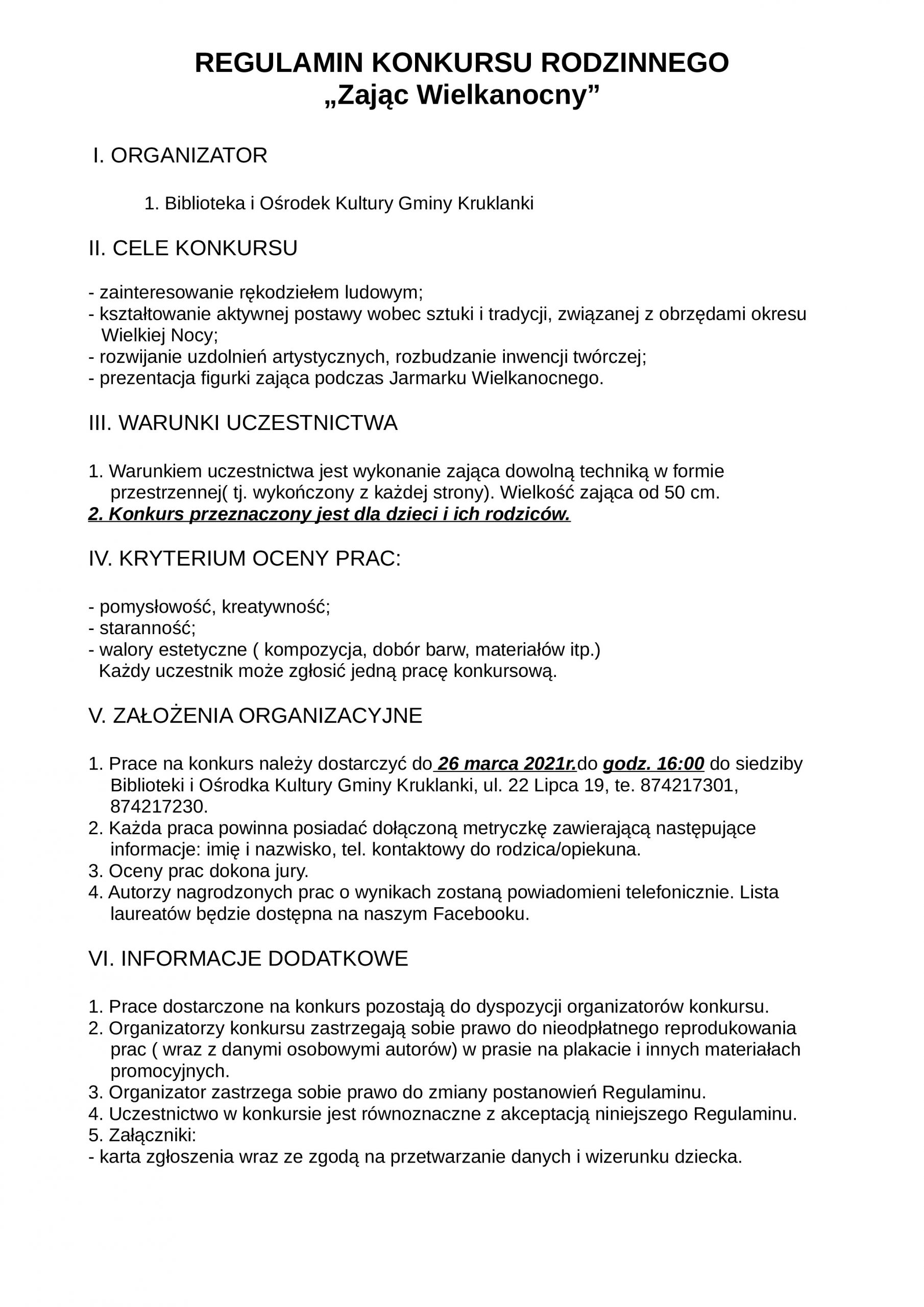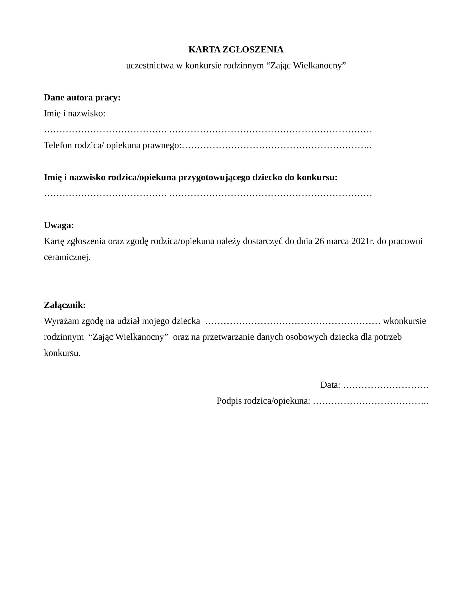 18 lutego 2021AKTUALNOŚCIgok Zapraszamy dzieci wraz z rodzicami do wzięcia udziału w konkursie wielkanocnym "Zając Wielkanocny".