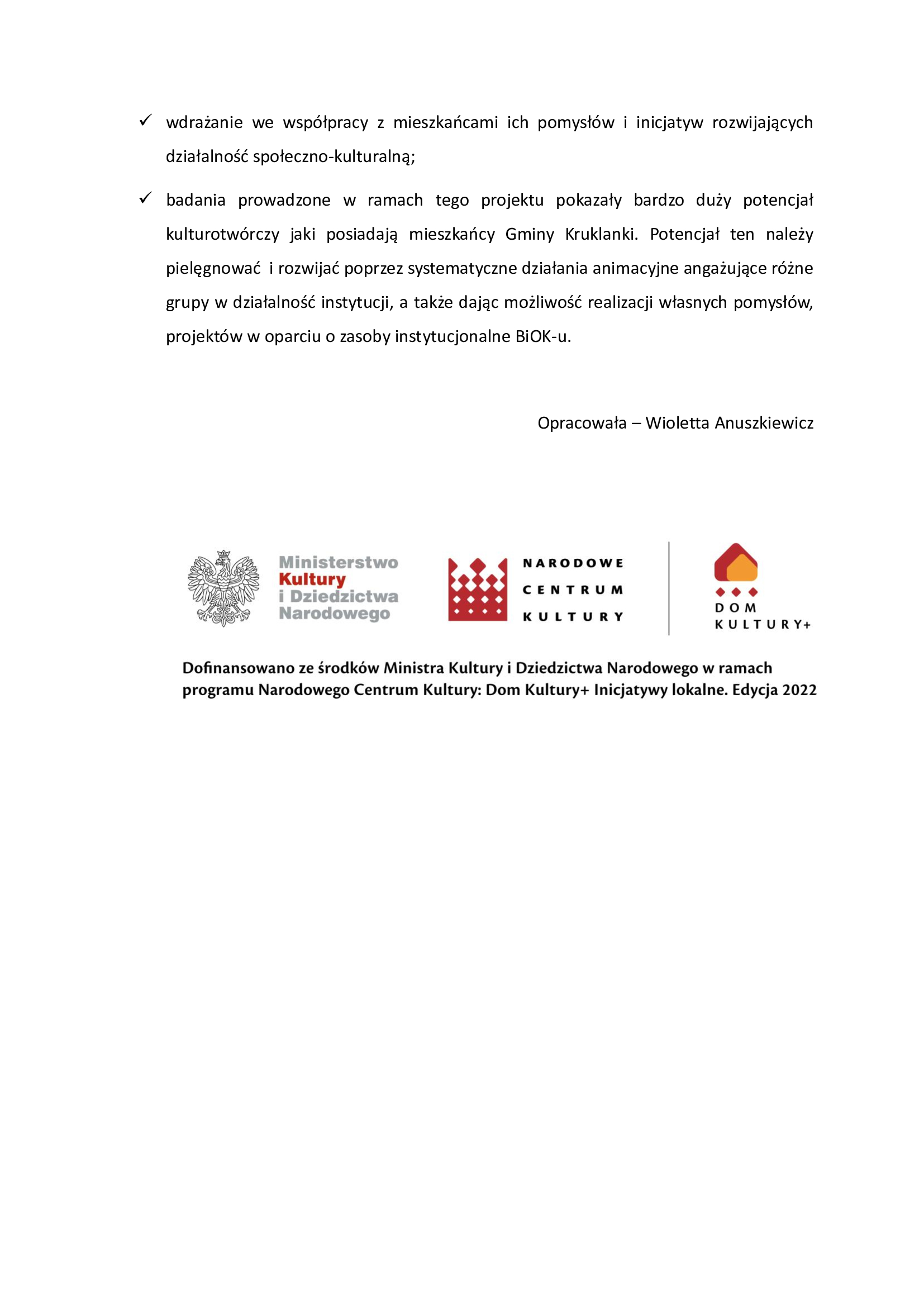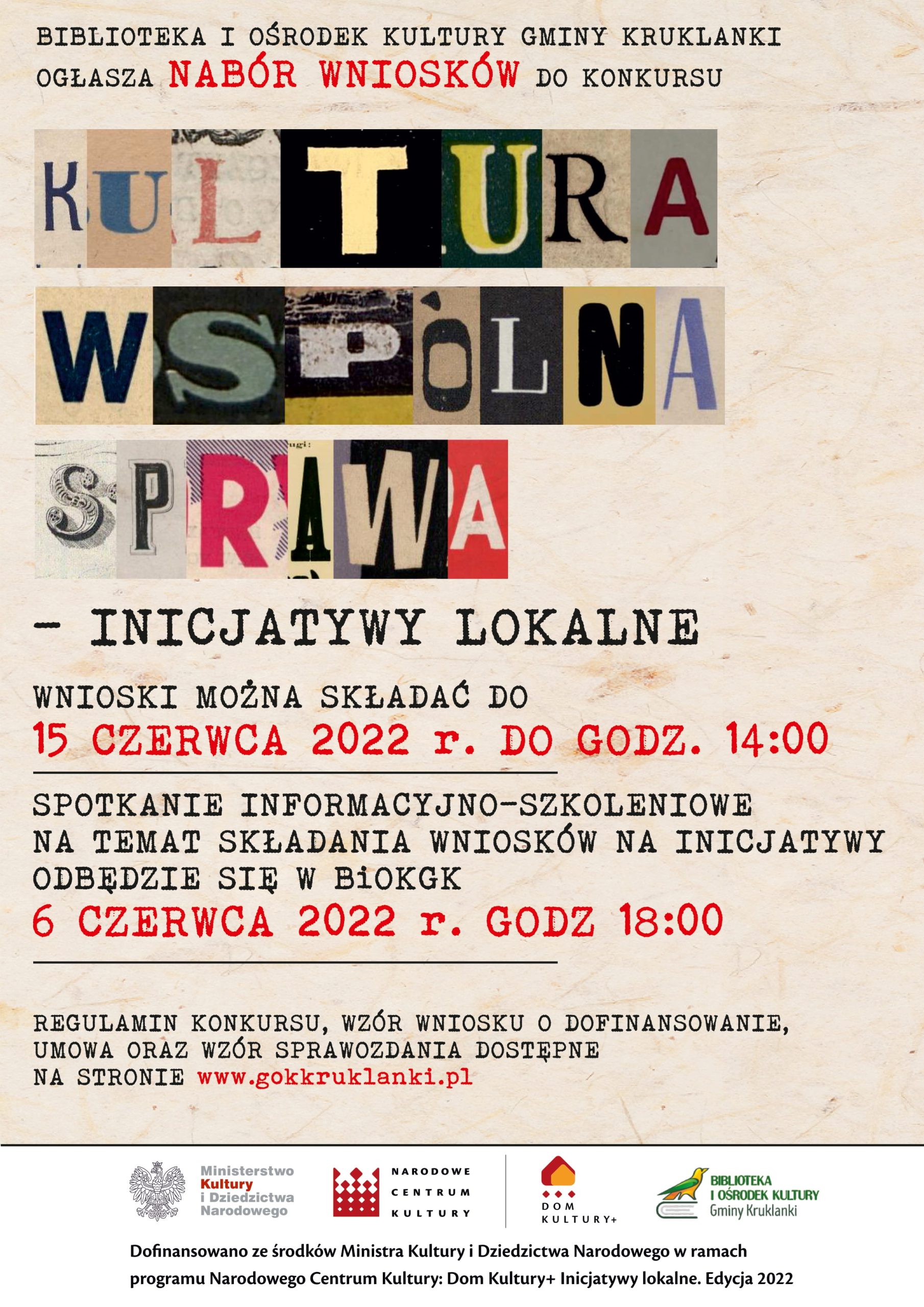 Biblioteka i Ośrodek Kultury Gminy Kruklanki ogłasza nabór wniosków do projektu "Kultura Wspólna Sprawa" w ramach programu Dom Kultury + Inicjatywy Lokalne. Edycja 2022 dofinansowanego ze środków Narodowego Centrum Kultury.