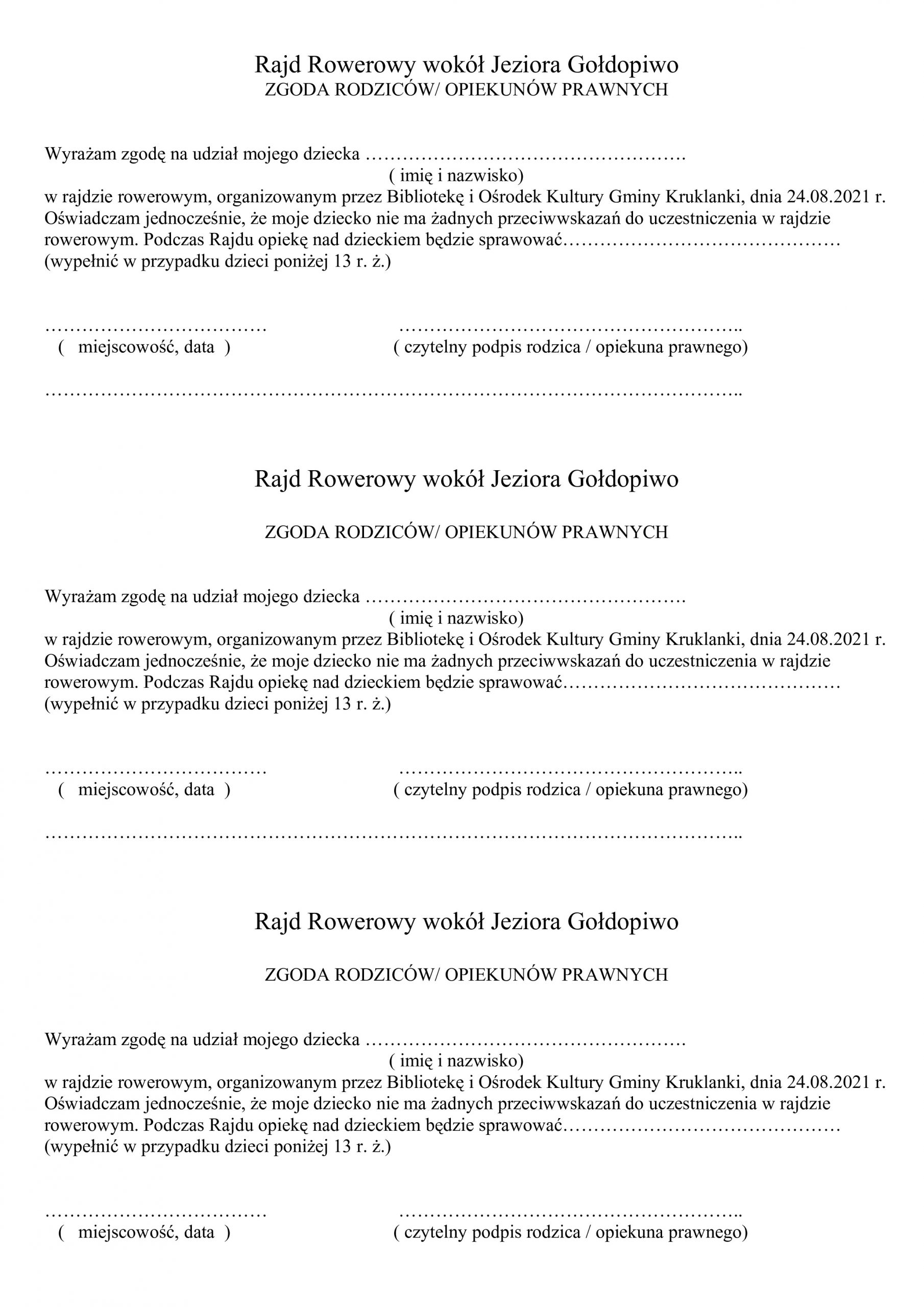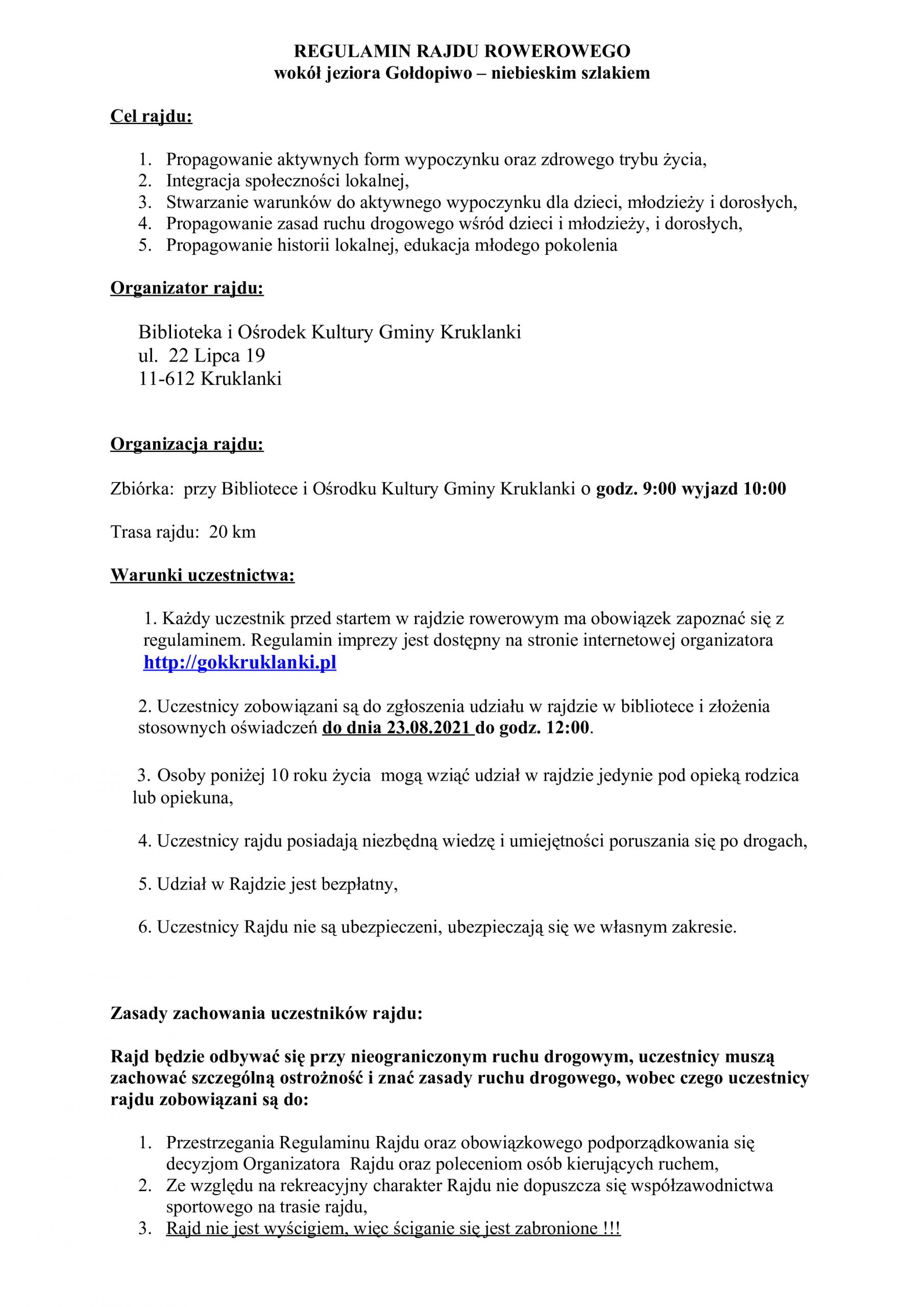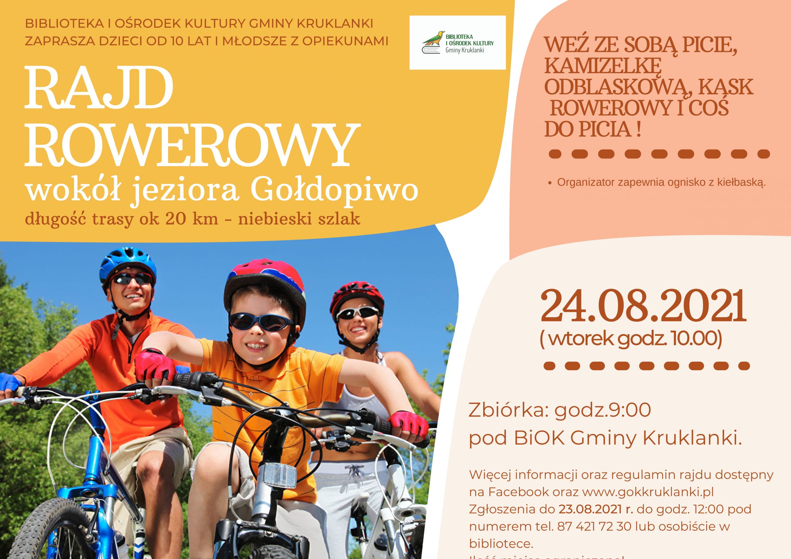 Zapraszamy dzieci i młodzież do wzięcia udziału w rajdzie rowerowym wokół Jez. Gołdopiwo, który odbędzie się 24.08.2021 r. Zbiórka o godz. 9:00 przy BiOK Gminy Kruklanki. Wyjeżdżamy o godz. 10:00. Długość trasy 20 km. Na  trasie przewidziane wspólne ognisko z kiełbaską.