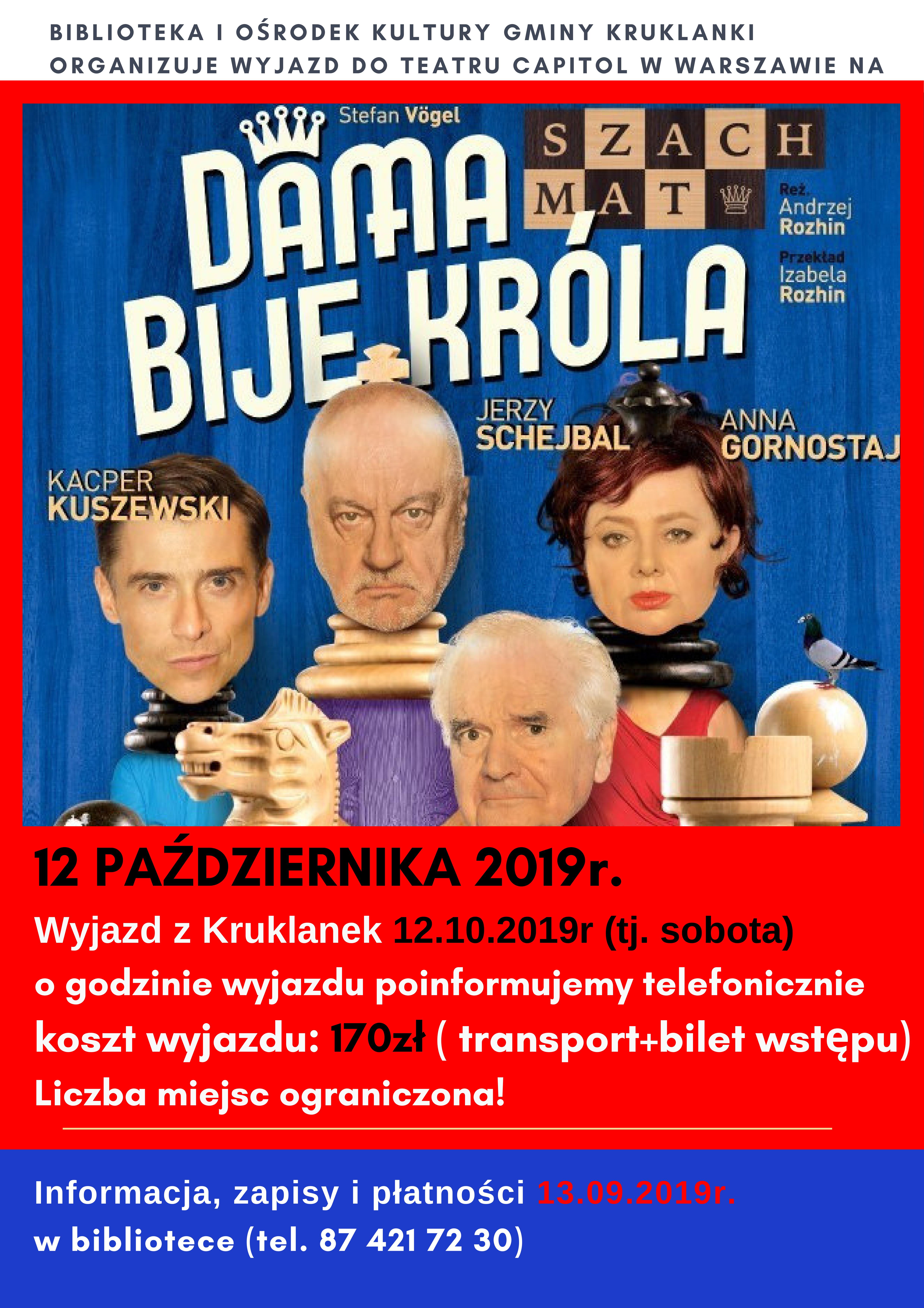 Biblioteka i Ośrodek Kultury Gminy Kruklanki organizuje wyjazd do Warszawy na spektakl pt. "Dama bije króla" w dn. 12 października 2019r. (sobota). Zapisy prowadzimy do 13 września.