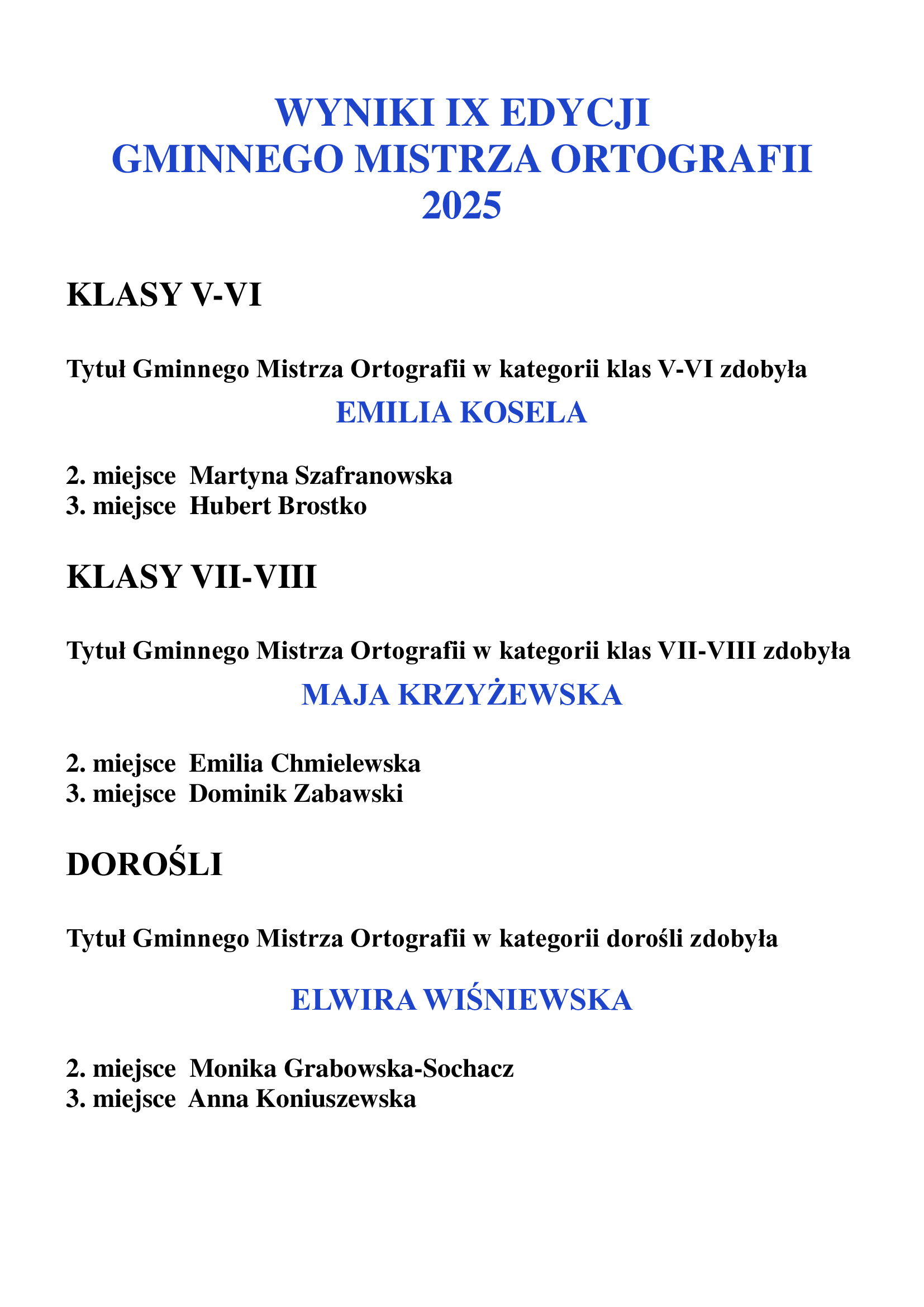 29 października 2025AKTUALNOŚCIgok 15 października w BiOK Gminy Kruklanki odbył się Konkurs Gminny Mistrz Ortografii 2025. Uroczyste wręczenie nagród jak co roku odbędzie się 11 listopada podczas koncertu. Poniżej przedstawiamy laureatów konkursu. Gratulujemy zwycięzcom!